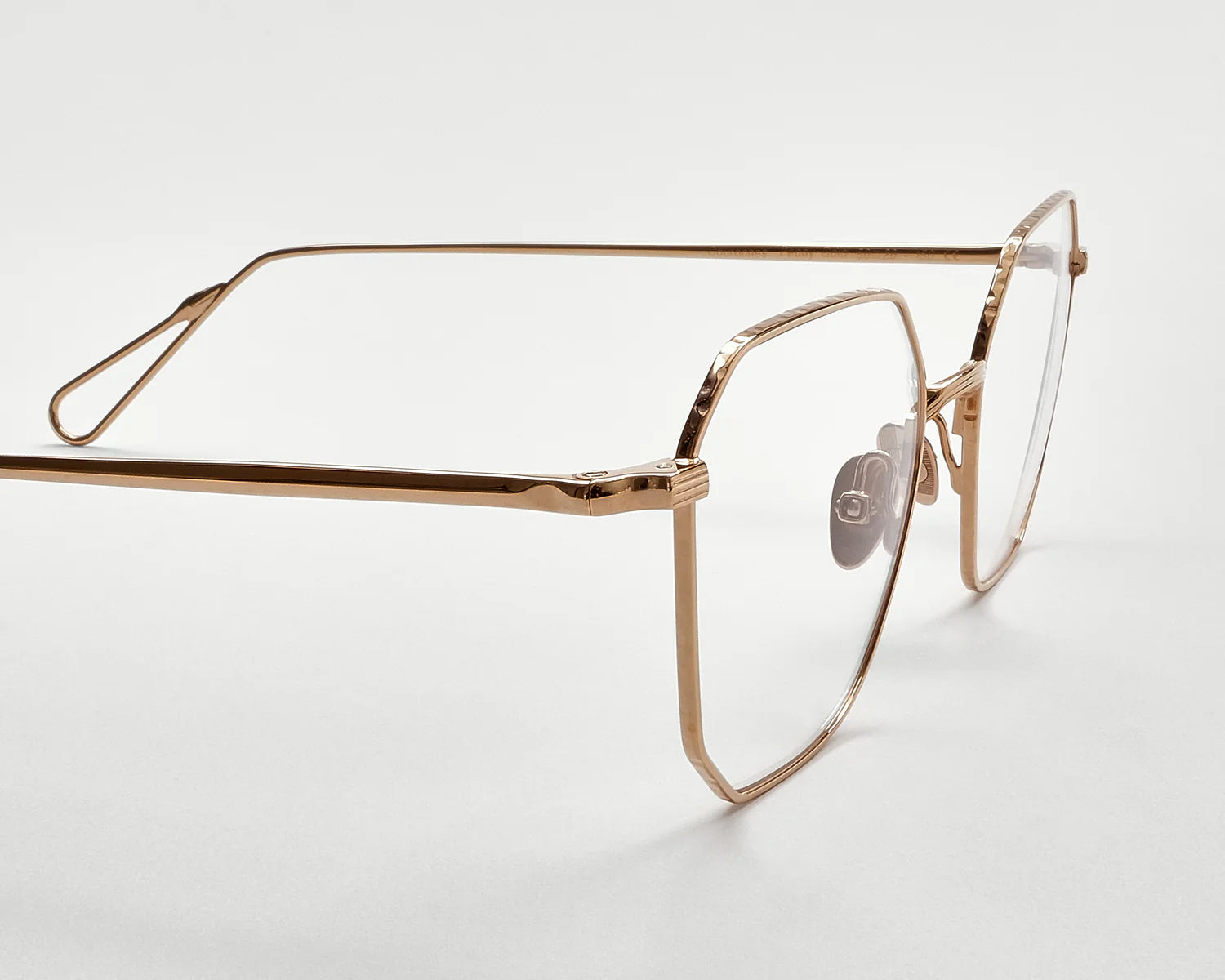Laser-engraved filigree nose pads that play with Bauhaus shape, made of titanium to ensure non-reactive and hypoallergenic aspects.