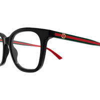 Commercial shape with the web detail on a slimmer temple. Squared cat-eye shape. Gucci interlocking logo on web temple. Commercial yet cool colour palette featuring institutional Green-Red-Green and Blue-Red-Blue web temples.