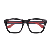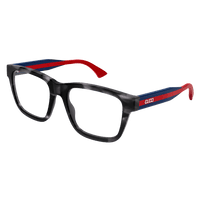 Commercial shape with the web detail on a medium temple. Squared shape. Gucci new lettering logo on web temple. Commercial yet cool color palette featuring institutional Green-Red-Green and Blue-Red-Blue web temples.