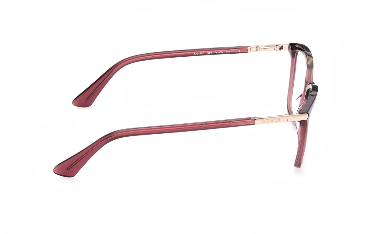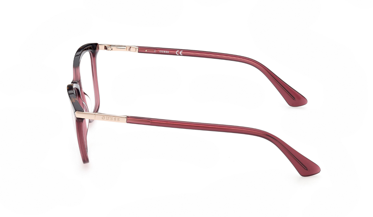 These elegant GUESS frames feature a rich wine hue with a subtle tortoiseshell browline and gold temple accents. A flattering shape that adds a touch of modern charm to any look.