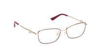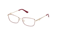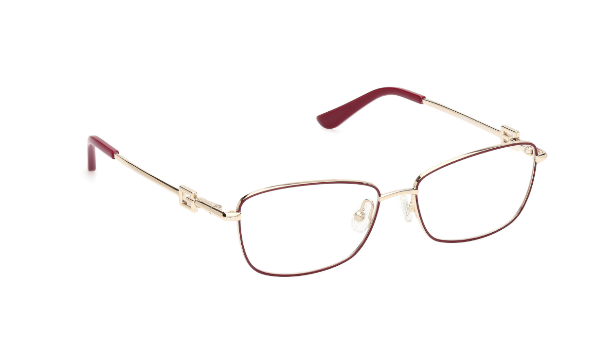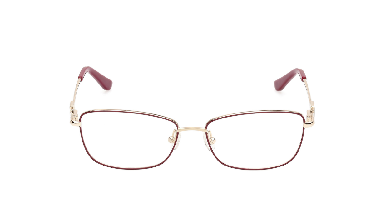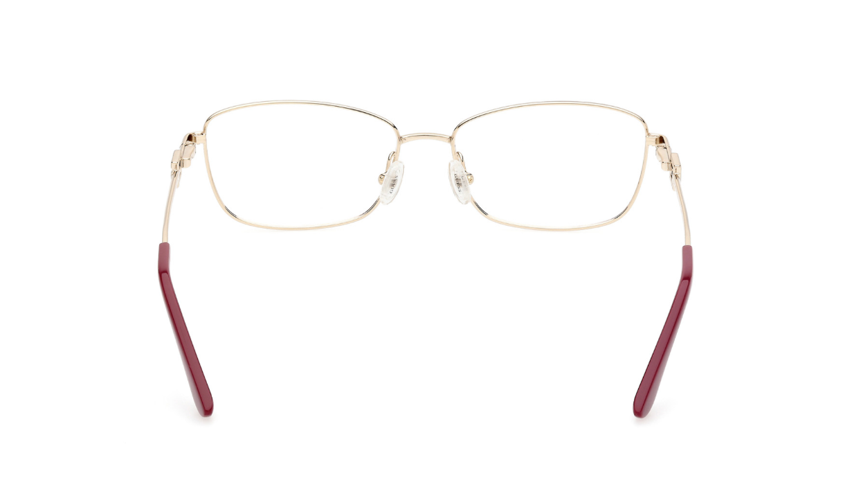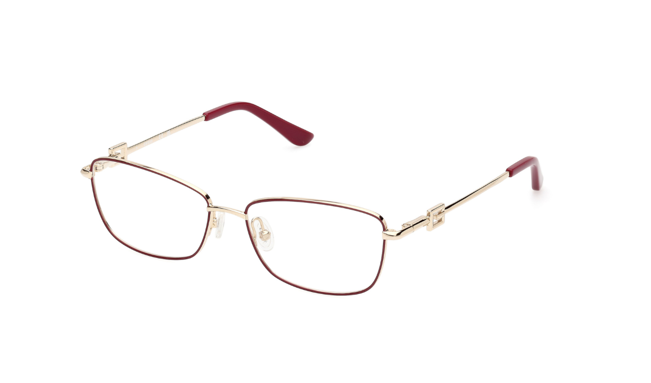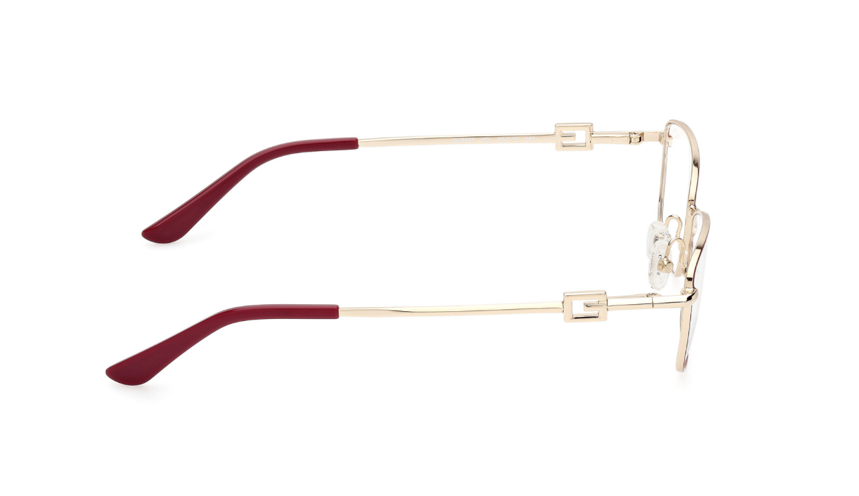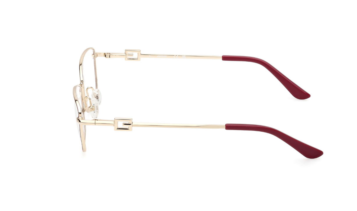 These lightweight GUESS frames feature a sleek gold metal design with burgundy accents and signature temple detailing. A refined, feminine look with modern sophistication.