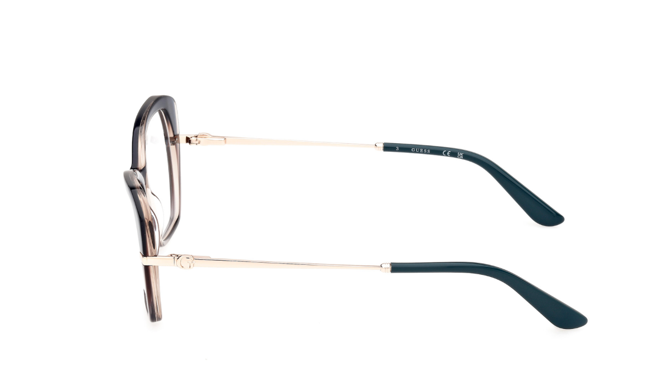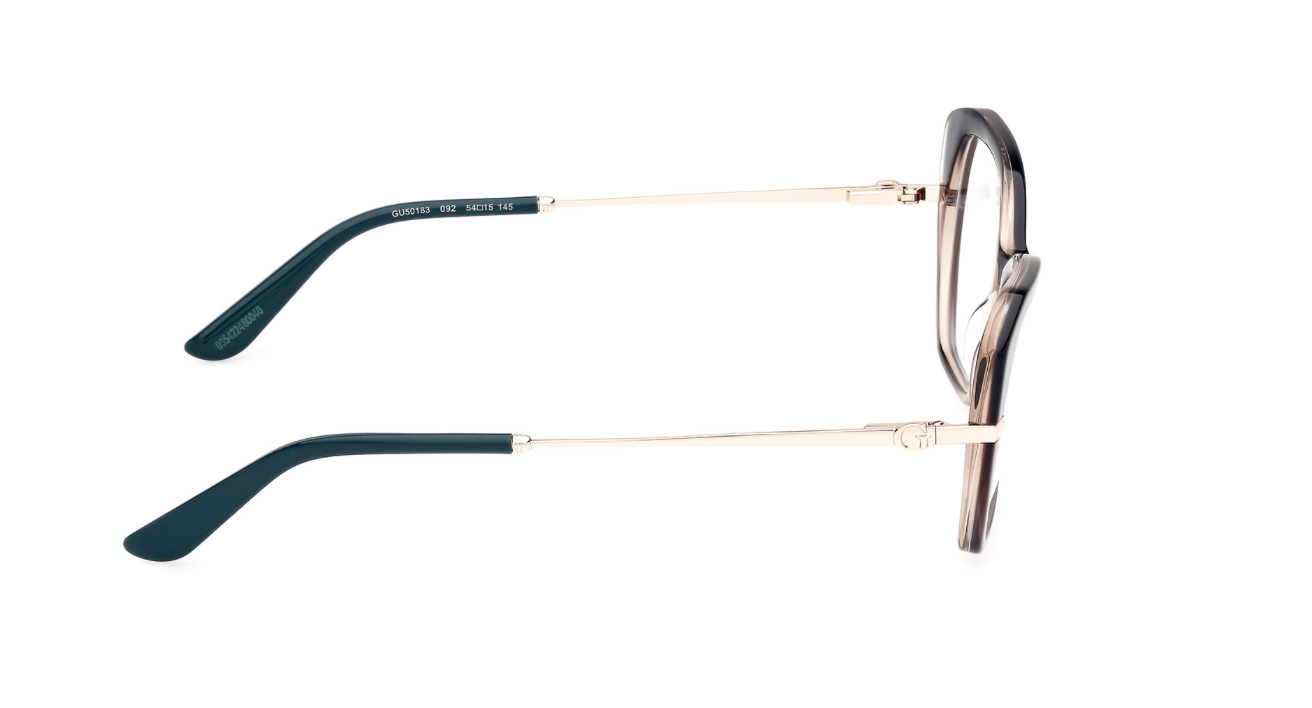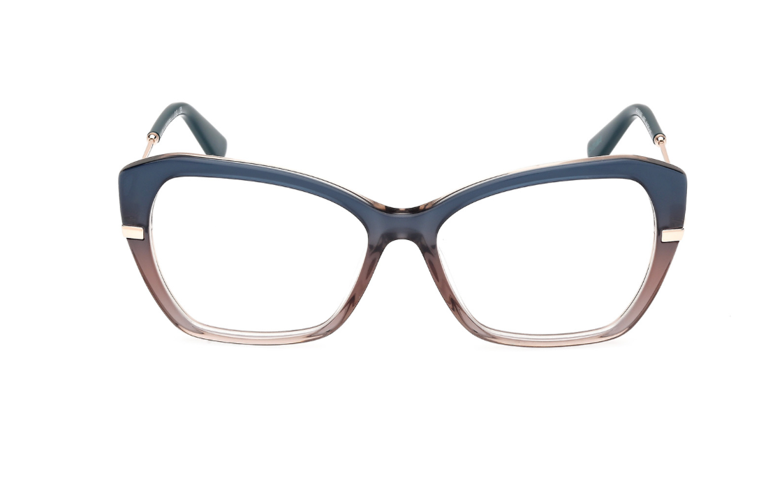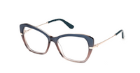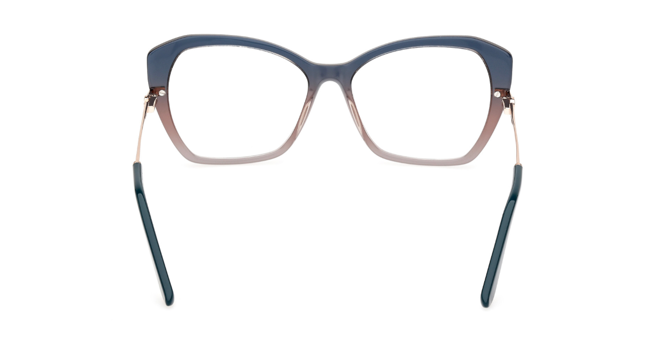 These GUESS frames feature a bold gradient design blending deep blue into soft blush, paired with slim gold temples. A striking mix of colour and elegance for a standout look.