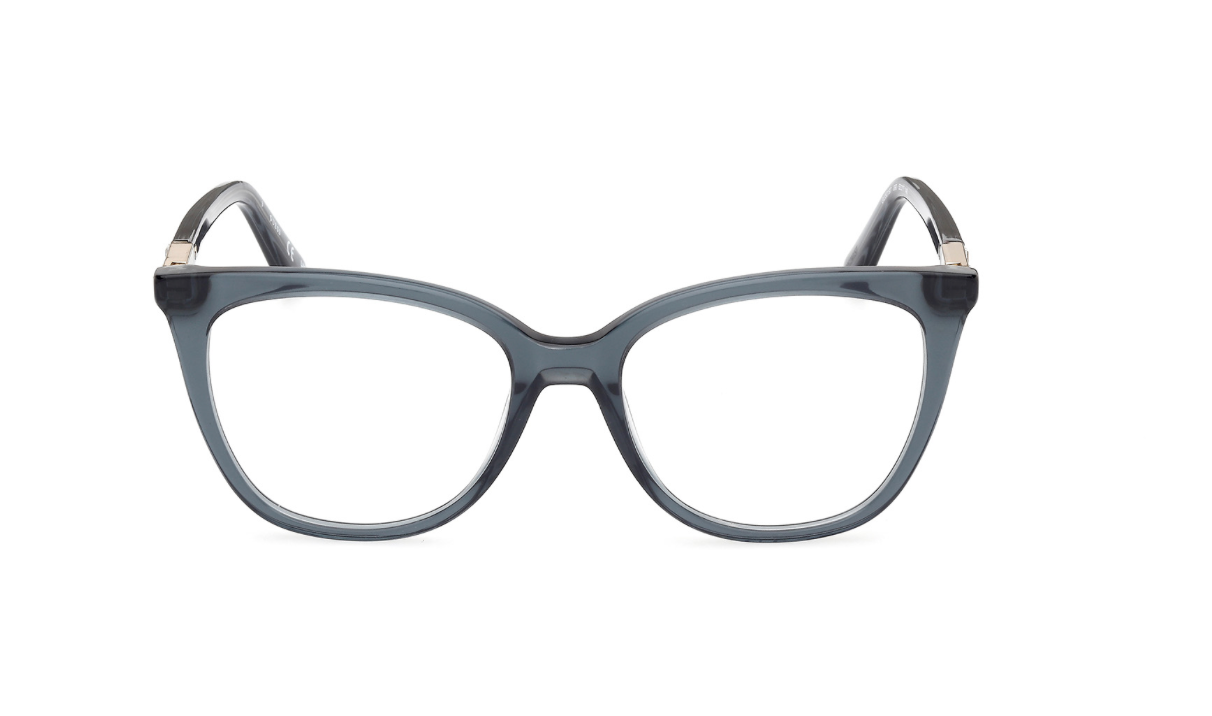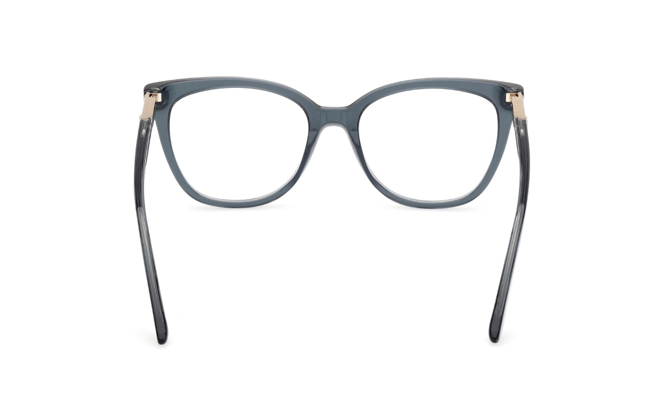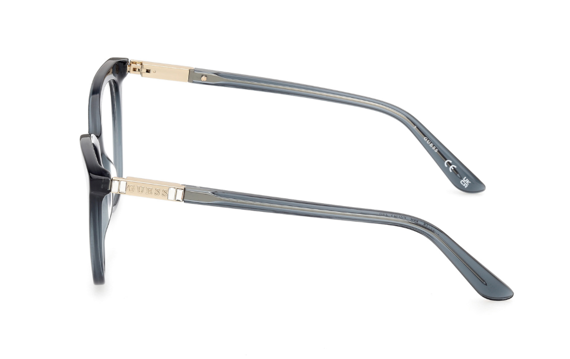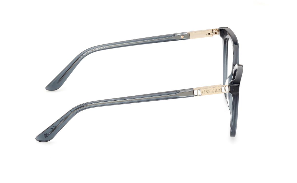 These smoky grey GUESS frames feature a soft cat-eye shape with gold hinge accents and sleek translucent arms—understated, modern, and effortlessly chic.