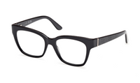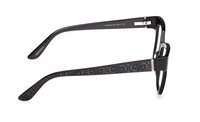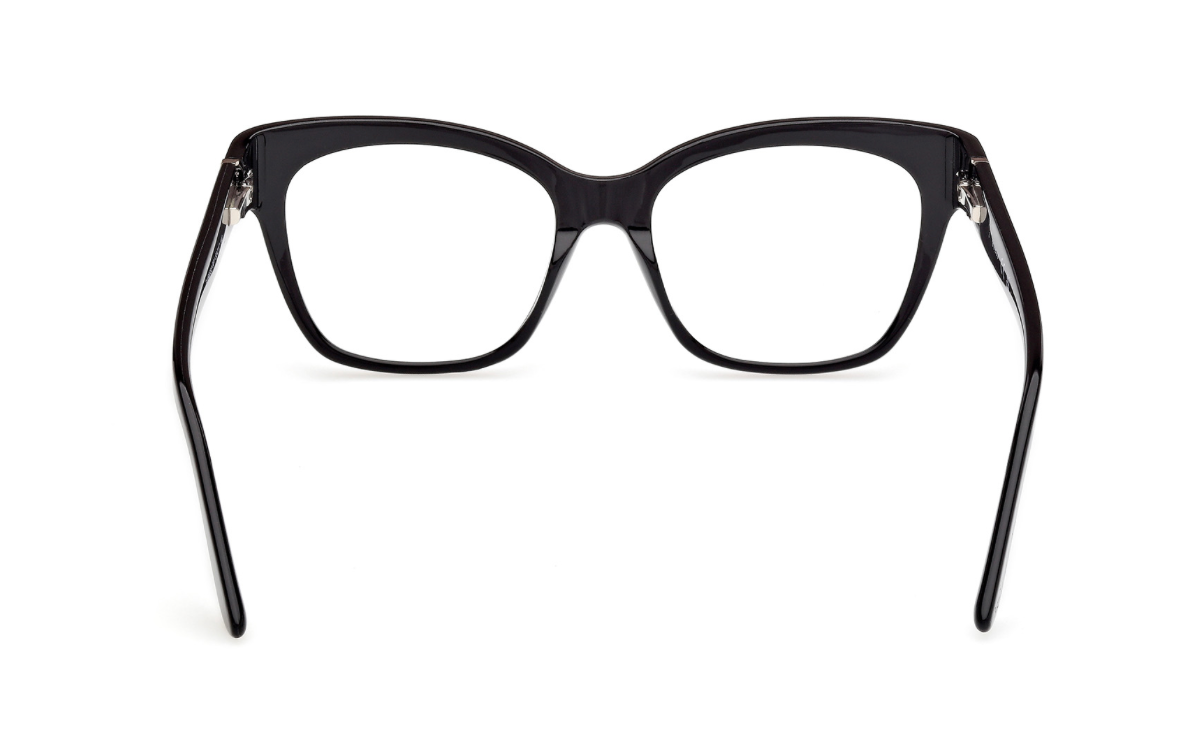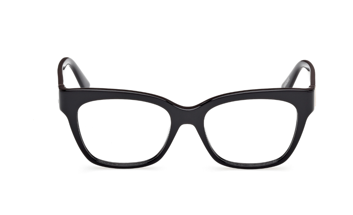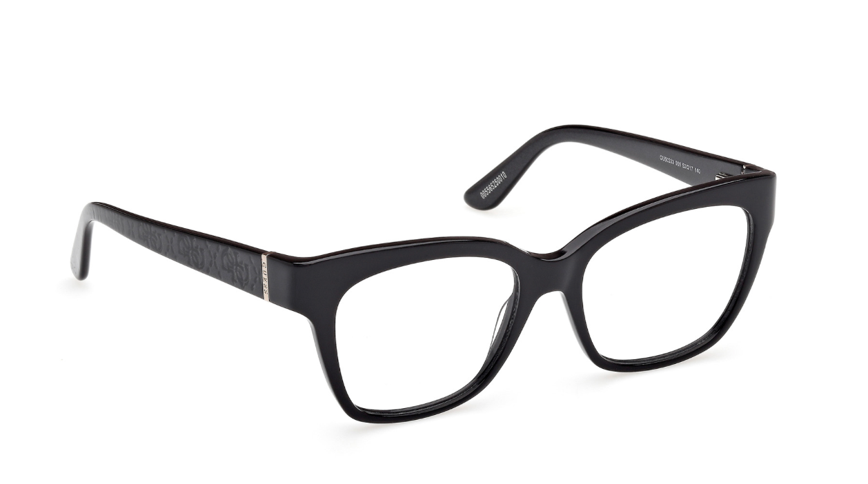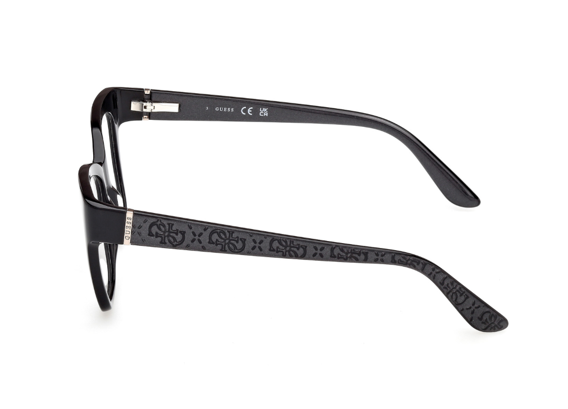 These sleek black GUESS frames feature a soft cat-eye shape with subtle embossed branding on the temples—classic style with a signature twist.