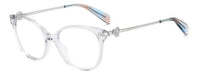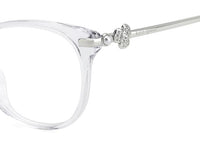 These Kate Spade eyeglass frames feature a softly rounded cat-eye silhouette in a delicate blend of crystal. Slim gold-tone metal temples are adorned with a signature spade emblem at the hinge, adding a touch of elegance, while the temple tips subtly echo the frame’s soft hues.