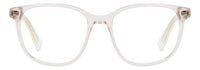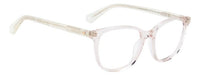 These Kate Spade eyeglass frames feature a soft square silhouette in translucent blush acetate. The temples, in a matching pearlescent cream tone, are accented with a subtle gold-tone hinge detail, creating a light, elegant, and versatile design perfect for everyday wear.
