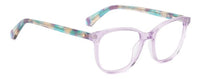 These Kate Spade eyeglass frames feature a soft square silhouette in translucent lavender acetate. The temples showcase a colorful marbled pattern in shades of teal, beige, and purple, accented with a subtle gold-tone hinge detail, bringing a playful and vibrant twist to the feminine design.