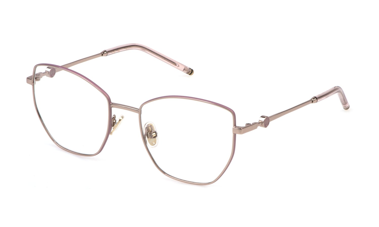 This Mulberry frame features a delicate geometric cat-eye design in a soft metallic rose-gold / mink finish with a subtle pink hue along the brow. Slim temples and refined detailing create an elegant, lightweight look with a modern, feminine edge.