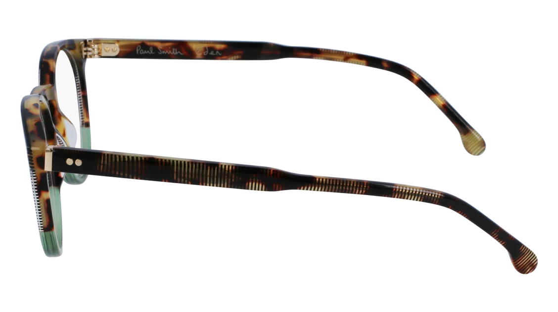 A bold yet refined statement piece, this Paul Smith frame combines timeless design with a modern twist. The rounded silhouette is crafted from premium acetate in a Stripes Havana Green finish, blending rich tortoiseshell tones with a distinctive green accent along the lower rim. Subtle stripe detailing along the temples and dual pin rivets at the front showcase Paul Smith’s signature attention to detail.