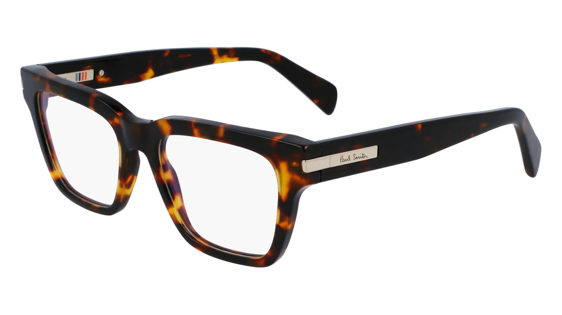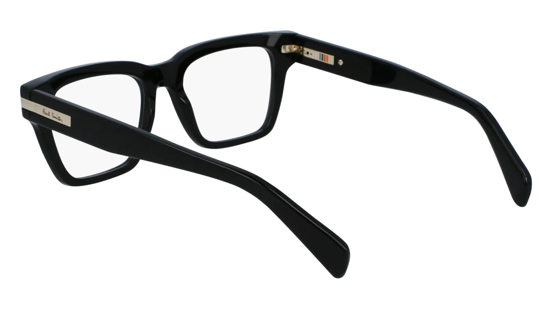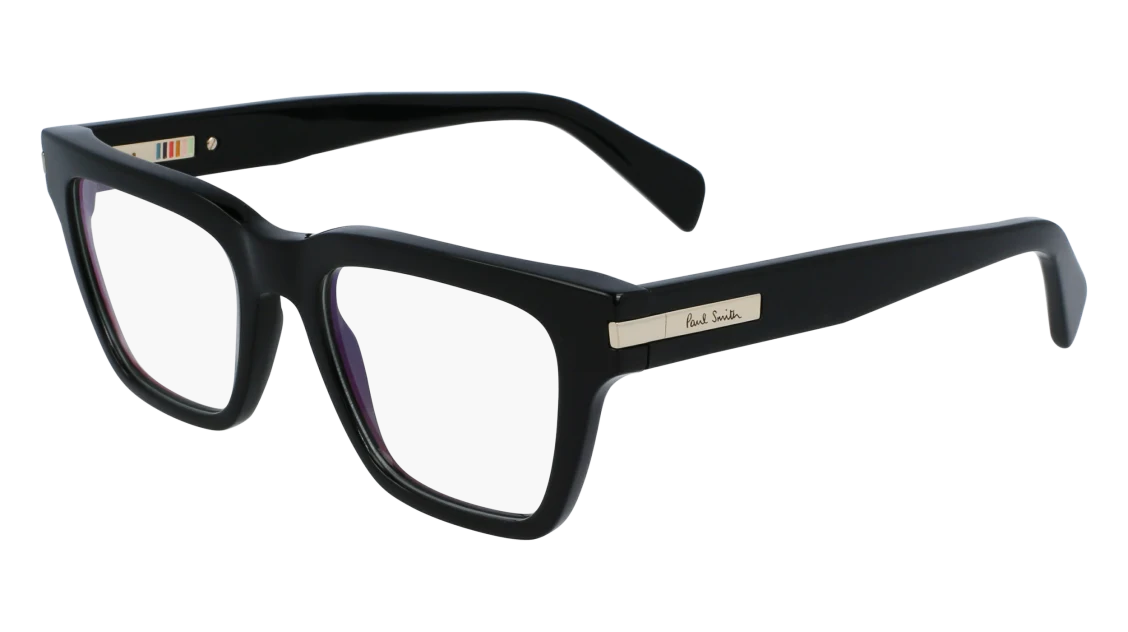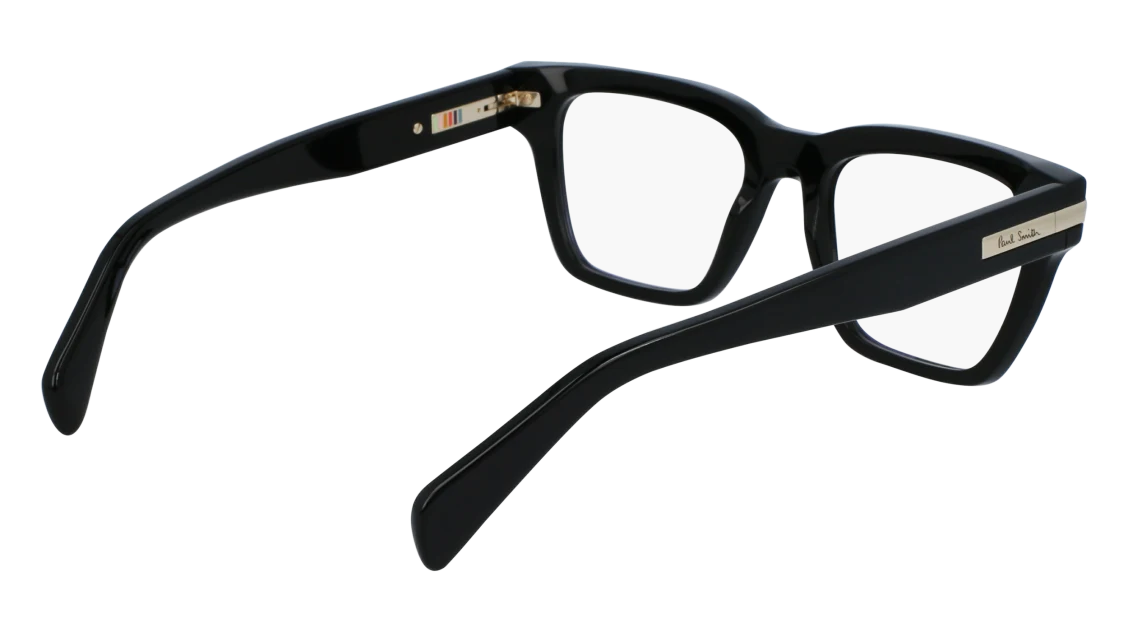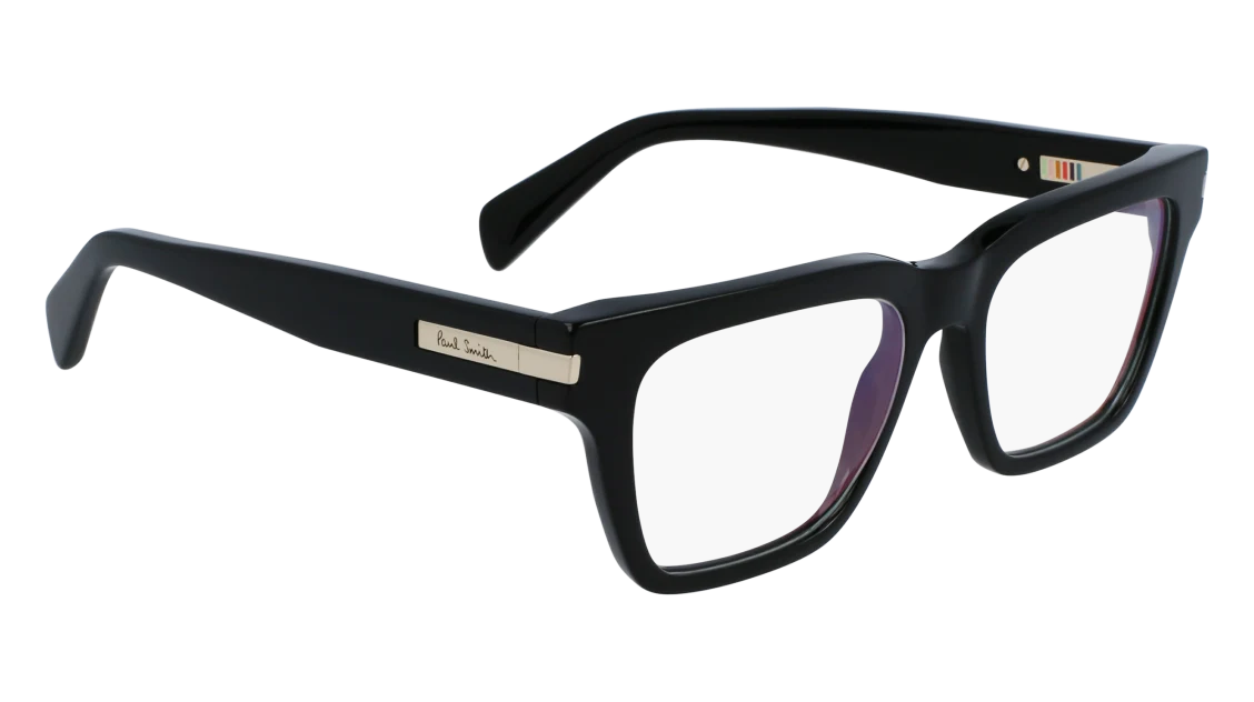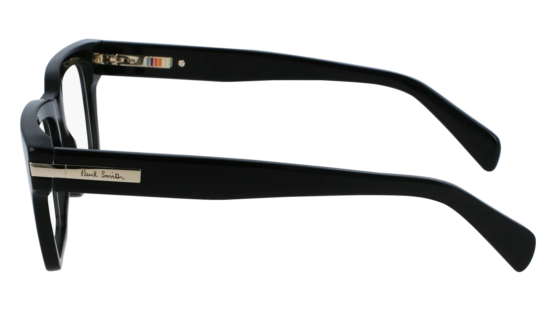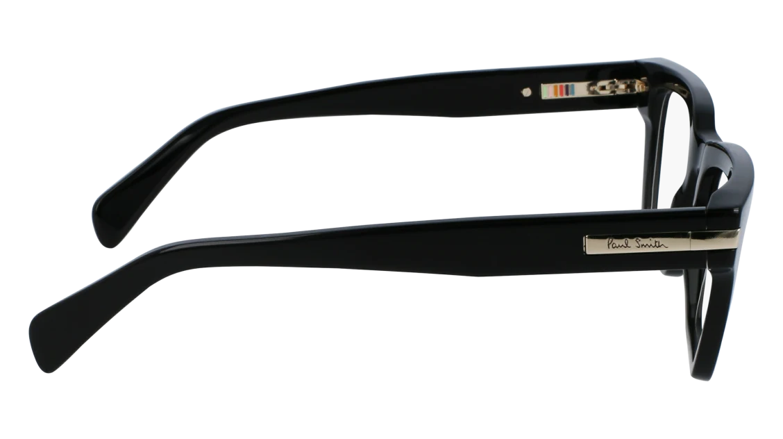 A modern classic, this Paul Smith frame combines thick black acetate with elegant metal temple detailing, engraved with the Paul Smith signature. The bold rectangular design delivers a confident, contemporary look while maintaining refined sophistication.