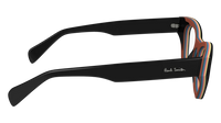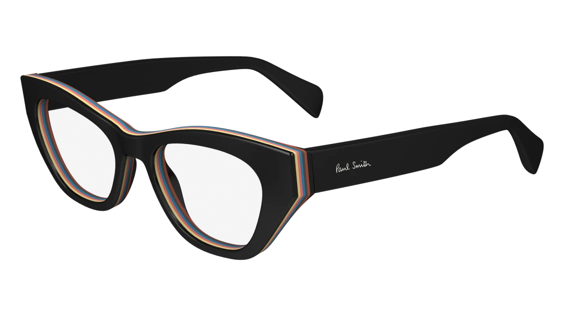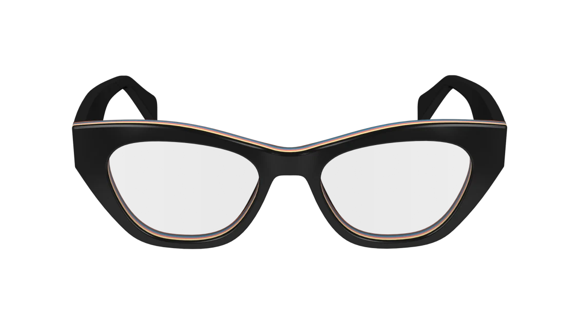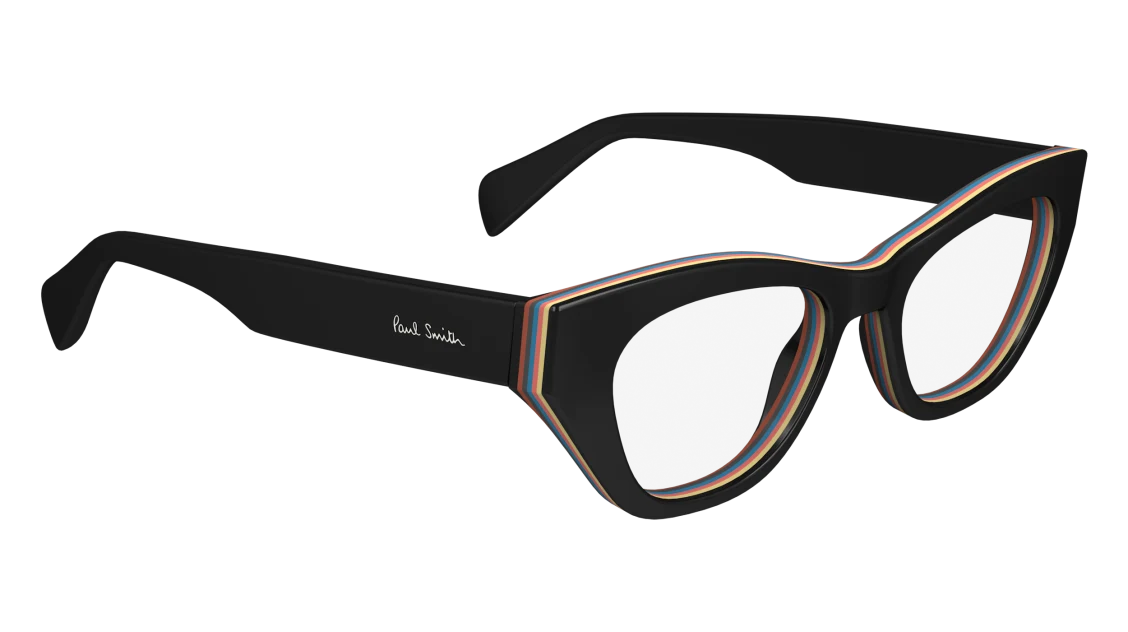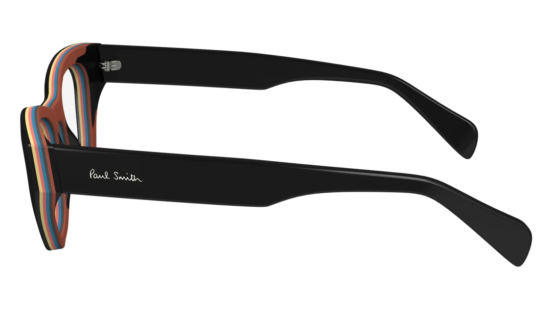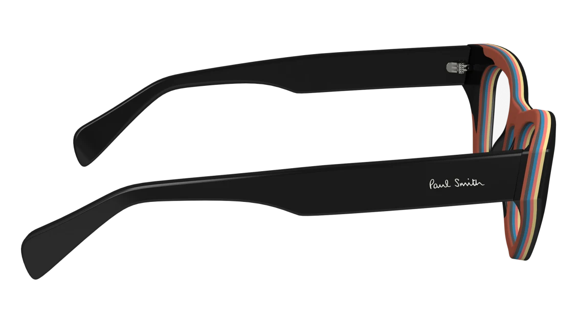 Bold and artistic, this Paul Smith frame takes classic eyewear design and gives it a playful twist. Crafted in premium black acetate, it features striking multi-colour stripe inlays along the brow line and inner rims — a signature Paul Smith detail that brings individuality and style.