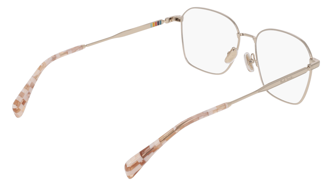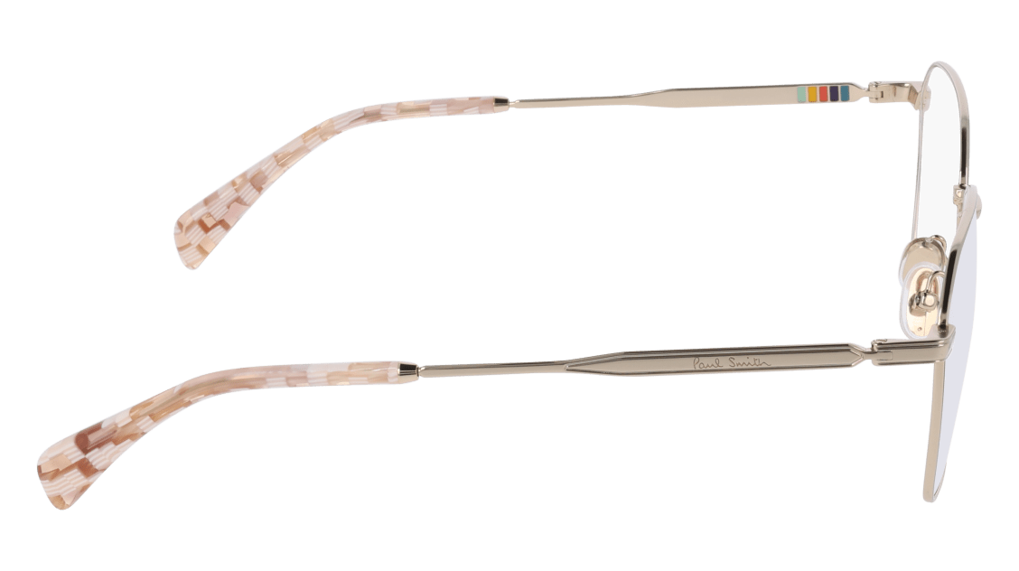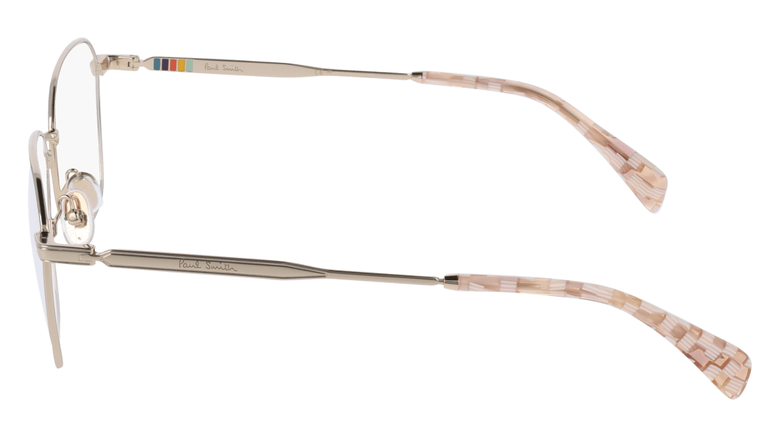 Elevate your eyewear with these refined Paul Smith square glasses. Crafted from lightweight gold-tone metal, the slim frame exudes elegance and sophistication. The geometric square lenses bring a modern edge, while the soft pink and white marbled acetate temple tips add a subtle touch of individuality and comfort. Adjustable silicone nose pads ensure a secure and personalised fit, making them as practical as they are stylish.