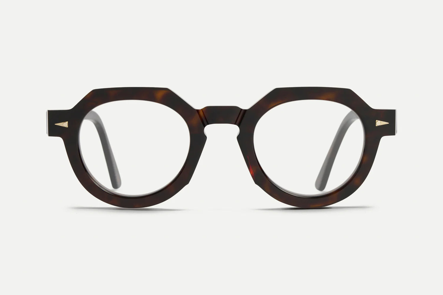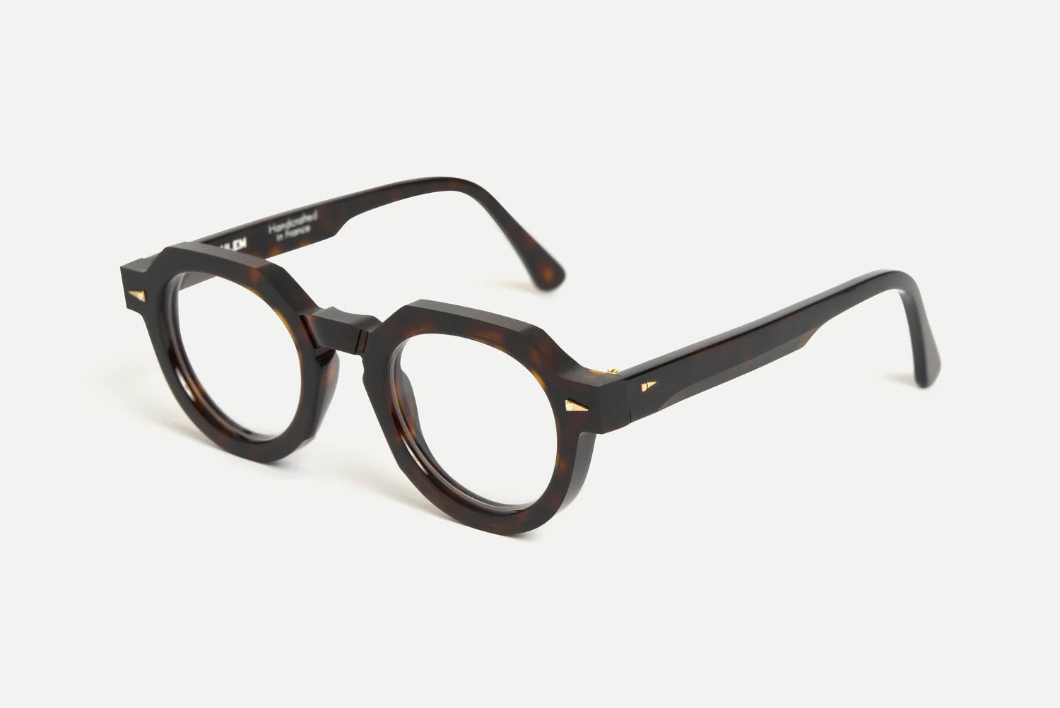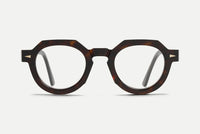 A direct and charming bookish frame with real presence and originality. Thick acetate, unconventional lines and a refined keyhole bridge team up in a style that marries intelligence and sophistication. Handcrafted in France.