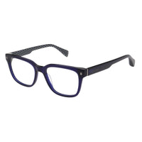 These Ted Baker eyeglass frames feature a bold square silhouette in deep navy acetate with subtle silver rivet accents at the front. The temples are finished with the Ted Baker logo, while the inner arms showcase a blue geometric pattern, adding a hidden pop of personality to the sophisticated design.