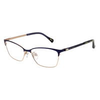 These Ted Baker eyeglass frames feature a refined semi-rimless design with a deep navy upper frame paired with warm rose-gold metal rims. Slim navy temples, adorned with the Ted Baker logo, transition to patterned tips with subtle green accents, adding a unique and stylish finish to the sophisticated silhouette.