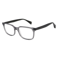 These Ted Baker eyeglass frames feature a modern rectangular shape in translucent smoky grey acetate. The sleek black temples are subtly detailed with the Ted Baker logo, while the inner arms showcase a striped monochrome pattern for a contemporary twist on a classic design.