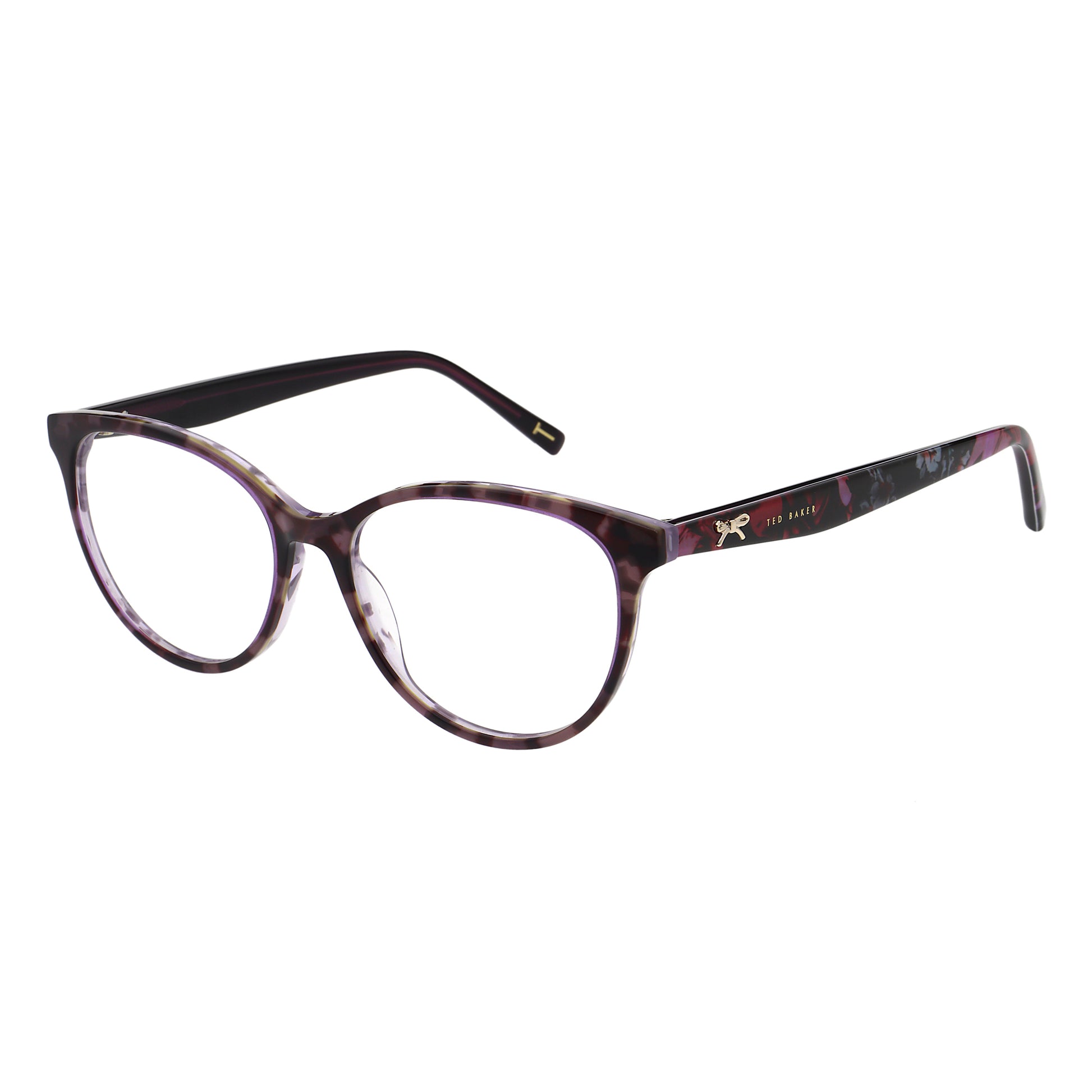 These Ted Baker eyeglass frames feature a soft cat-eye silhouette in a marbled mix of purple, taupe, and cream tones. The temples are accented with the signature gold bow and Ted Baker logo, while the inner arms showcase a subtle floral pattern, blending elegance with a hint of playful charm.