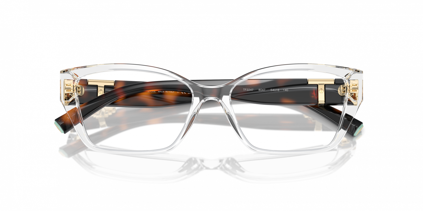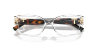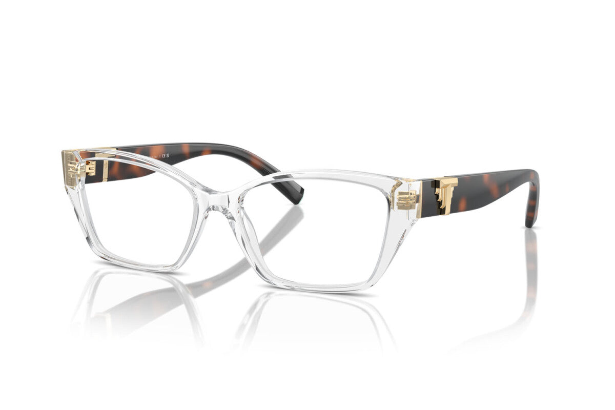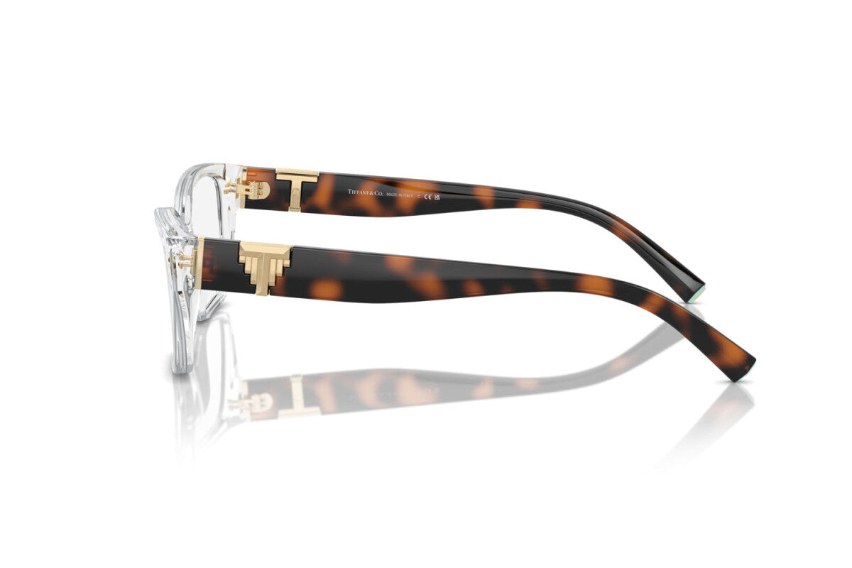 Chic and sophisticated, this Tiffany & Co. frame in Crystal and Havana brings together modern transparency with timeless tortoiseshell for a striking contrast. The crystal-clear acetate front offers a fresh, contemporary look, while the Havana temples add depth and warmth, enhanced by Tiffany’s signature gold “T” hinge detailing for a luxurious finish.